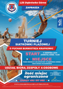 Turniej siatkówki plażowej o Puchar Burmistrza Krapkowic przez dabrowka · 3 sierpnia 2025 Zarząd LZS Dąbrówka Górna zaprasza na turniej siatkówki plażowej o Puchar Burmistrza Krapkowic, który odbędzie się w sobotę 9 sierpnia 2025 roku o godzinie 14:00. Udostępnij